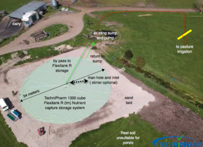 Sort it out in no time.... confirm now and safe, we roll out, you connect and pump that easy With FLEXTANK R)tm) there is no longer an issue, this system designed specifically for ezy storage is more or less ready to use the day it arrives on farm. With a complete closed system you will capture no rain water, there is no smell, and no crusting, easy pump in and pump out and with an optional internal super efficient OLOID® stirring system you win all the way to the bank and back. The Round Flexitank R ™ is the latest structural design upgrade which mean the Bladder has superior strength ( no corners) and even distribution of forces ( all outward in same energy as its round) Older designs are square or rectangle and have larger stress points on corners . Therefore with FLEXITANK R ™ we can store higher (up to 1400 mm) as opposed to square or rectangle 1100 mm ( so FLEXITANK R (ound) takes up less ground) Access points are easy as we have an inlet in middle with ability to go 360 degrees direction to where we need it and outlet determined by placing Bladder where we want it so we do not have to pre determine where this is placed as its round so we can turn it what ever way we want ( now or later) An access manhole is standard and allows for a mixer to be installed if required. FLEXTANK R™ is most suitable for unstable grounds, and in situations were there is emergency storage needed as a back up, or 30-100 day storage at certain times of the year, but where most effluent is pumped out direct to pasture most of the time. Where there is a feed pad and larger amounts of solids are present the ECOBAG™ system should be considered as a superior long term solution. ECOBAG and FLEXITANK R are 100% recyclable, thus providing new materials for future use