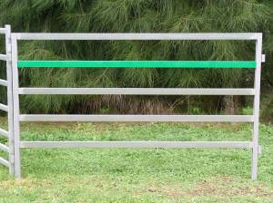 WeeYards Greenline™ Panel - ideal for the lifestyle farmer. Just because you handle fewer animals does not mean to say you need less gear or equipment which is light and weak. In the end any large farmer or lifestyle farmer will handle each animal by itself. The Greenline™ however, are built to allow the larger animals to be handled in a special high tensile yard system which can deal with the size animal but not with the large mob sizes. Which is what sets it apart from the Smart Yards™ system or alternative steel yards. The Greenline™ is smart, looks good (its got that green line!), its strong, its got a wide profile visual impact railing system, its galvanized, it provides instant panel length adjustment (rails can be cut and reasembled easily within the frames) and its a safe system with the unique escape roll under rail, which creates extra safety for people in yards who normally may not be totally familiar with handling cattle. The escape space allows someone to drop to the ground and roll under the rail (say if a bull or cow becomes aggressive). Panel specifications: rail: 63mm heigh 37mm wide all pregalv (supergalv) green rail: zinc shield plus powder coat panel length: 2530 mm c to c lug height: 1510 mm feet both ends post: 63 by 37 U profile folded, hot dipped galvanized, HT 2 mm rail spacing: 215 mm bottom rail: 350 mm (roll escape space)